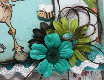 What a fun card Hanne! Love the cheerful papers and flowers, the netting and twines are beautiful accents as well. I always love each little detail in your cards. Fabulous job coloring the moose too. Love this! :)